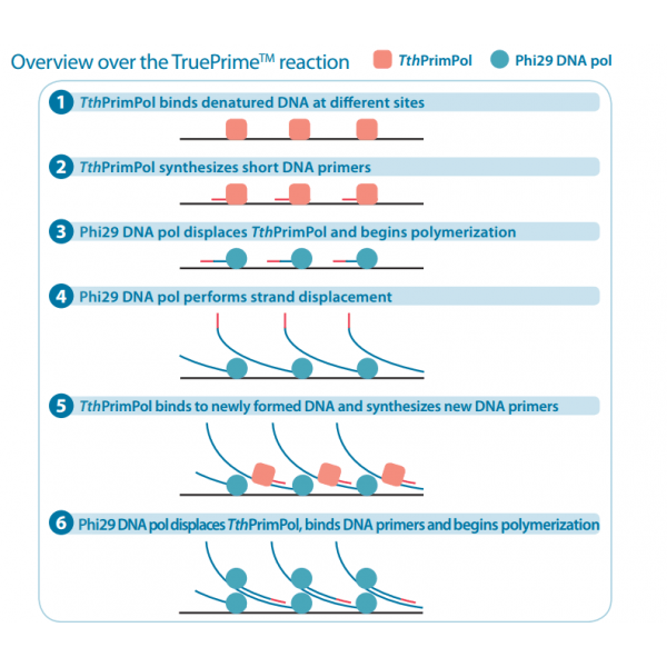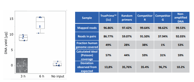 TruePrime?采用MDA技術(shù),基于新型的TthPrimPol 引物酶和Phi29 DNA聚合酶,擴(kuò)增過程無(wú)需添加隨機(jī)引物,減少了擴(kuò)增偏倚,提高了擴(kuò)增過程的覆蓋率和保真性,并且對(duì)于污染的外源DNA不敏感,可重復(fù)性好。TruePrime?可用于單個(gè)細(xì)胞或少量細(xì)胞的全基因組擴(kuò)增,與常見的NGS平臺(tái)如Illumina和IonTorrent等兼容性良好。