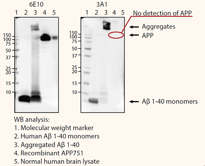 在WB實驗中檢測克隆號3A1抗體針對人Aβ1-40單體、Aβ1-40聚集體、重組人APP751蛋白和正常人腦裂解物的特異性。與克隆號6E10抗體相反的是,3A1與APP無交叉反應(泳道4、5)但是與Aβ1-40聚集體顯著反應(泳道3)。與6E10相比,3A1表現出對Aβ1-40單體的較弱反應性(泳道2、3)。
