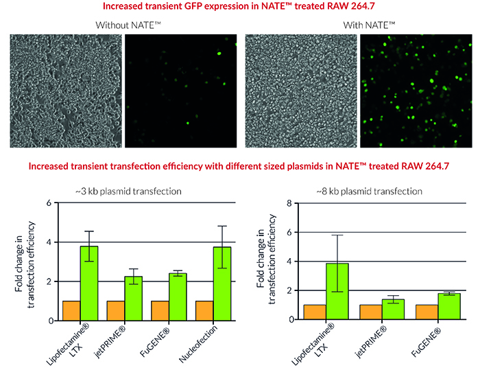 NATE?是由InvivoGen專門推出的核酸轉染增強劑,用于提高免疫細胞的瞬時和穩定轉染效率,尤其適合THP-1和RAW 264.7細胞,只需在轉染步驟前添加NATE?孵育30分鐘,即可進行后續轉染操作。