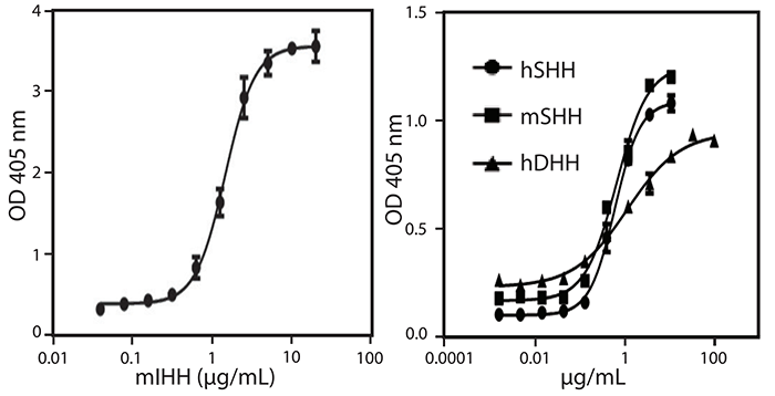 C3H10T1/2干細(xì)胞培養(yǎng)至細(xì)胞融合,使用BMP-9(20 ng/mL, Cat. No. 553102)和不同濃度的h/mSHH、或hDHH、或mIHH(Cat. No. 753502, 754602, 759802,758602)處理,將間充質(zhì)干細(xì)胞誘導(dǎo)分化為成骨細(xì)胞。使用對(duì)硝基苯磷酸酯作為底物,檢測成骨細(xì)胞標(biāo)記物堿性磷酸酶。