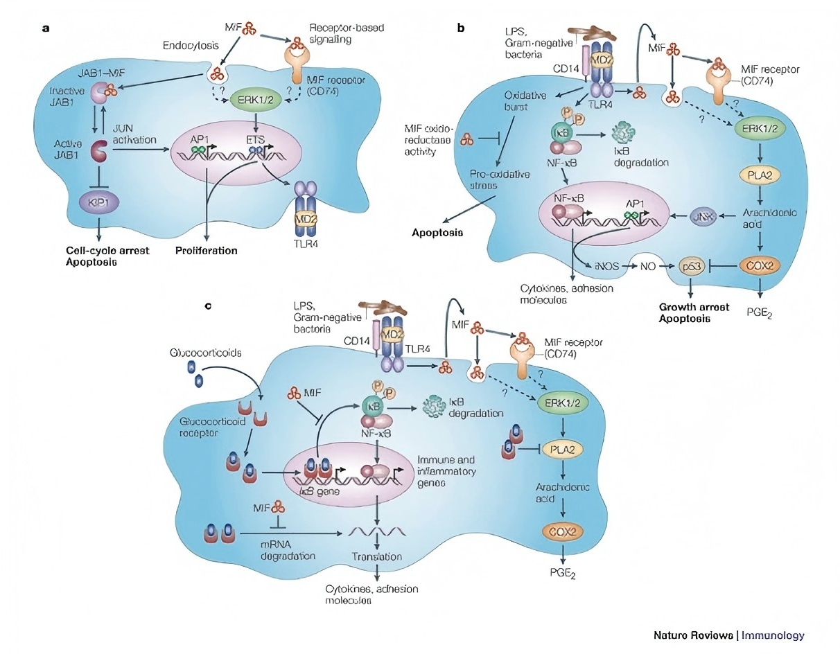 當(dāng)用 LPS 刺激時,巨噬細(xì)胞釋放 MIF。免疫細(xì)胞的其他促炎效應(yīng)分子,如 TNF 和 IFN-γ,也是巨噬細(xì)胞產(chǎn)生 MIF 的強(qiáng)誘導(dǎo)劑。MIF 在組織或體循環(huán)中釋放后,作為一種經(jīng)典的促炎細(xì)胞因子,通過激活巨噬細(xì)胞和 T 細(xì)胞來促進(jìn)先天性和適應(yīng)性免疫反應(yīng)。