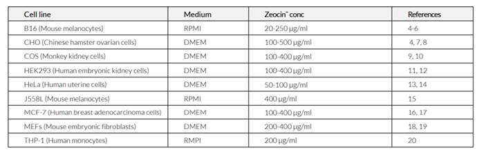 Zeocin?通常以100 μg/ml的濃度使用,即將原液(100 mg/ml in HEPES buffer)稀釋1000倍使用。但也需要根據(jù)您的具體細胞來確定最佳濃度。下表列出了在一些哺乳動物細胞篩選實例中的Zeocin?建議濃度。