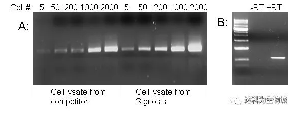 圖2 A: 比較Signosis與其他品牌的細胞裂解液。分別對裂解產物中的β-actin進行30個循環反轉錄PCR。