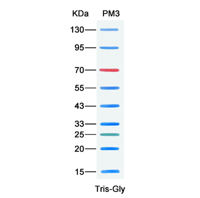 預染蛋白Marker是將幾種純化好的蛋白,與染料共價偶聯后混合而成。預染蛋白Marker的出現方便我們在電泳時、電泳后以及轉膜后檢測電泳情況和估計遷移率,是做WesternBlot最常用到的蛋白Marker。