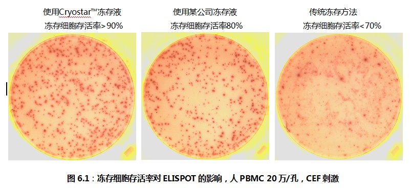 在ELISPOT檢測的應用中,往往需要用到凍存的淋巴細胞樣品作為檢測細胞。由于ELISPOT檢測的是細胞的免疫功能,不僅僅需要保持細胞的存活率,而且還要保證細胞的功能不發生變化。傳統的細胞凍存方法通常是為了保存細胞株,對細胞存活率的要求不高,更沒考慮保持細胞原有的免疫狀態,所以傳統的細胞凍存方法已經不能滿足ELISPOT檢測的要求。參見圖7.1。