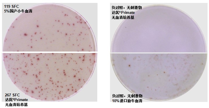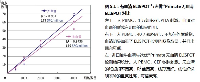 達科為公司做了一系列的有、無血清ELISPOT檢測對比試驗,并且在推廣ELISPOT技術的標準化以及建立ELISPOT檢測的質控系統時,都采用了無血清ELISPOT檢測技術。在所有的實驗中達優?都取得了優于血清的結果。總結起來就是:背景更干凈,信噪比更高,頻率更穩定,結果更真實。下圖5.1是一些實際案例。