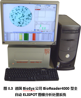 德國Bio-Sys公司從上世紀80年代開始就致力于生物圖像識別領域,在進入ELISPOT圖像分析儀市場后一直以其先進的ELISPOT斑點識別技術(shù)聞名。德國Bio-Sys公司首先解決了顯微攝像系統(tǒng)難以定位96孔板上的每一個孔的問題。其解決方法基于圖像識別技術(shù),利用板孔邊壁和真正的孔底的細微差別,在機械定位的基礎上,通過軟件識別來進一步提高每孔的定位精度。是目前市場上所有ELISPOT圖像分析儀中唯一能夠完整識別整個孔底ELISPOT斑點圖像的設備。在對真假斑點的分辨中,德國Bio-Sys公司除了具備完善的物理學多參數(shù)識別技術(shù),還特別針對ELISPOT斑點形成的生物學過程,通過細胞因子顯色后的“光密度”峰值積分分析方法,精確分辨真假斑點、融合斑點等復雜情況。Bioreader系列ELISPOT圖像分析儀國外大多數(shù)較有經(jīng)驗的ELISPOT實驗室推崇的特點為:專業(yè)性和參數(shù)全開放性。因為ELISPOT實驗的復雜性,ELISPOT斑點形成在不同的實驗條件下有非常大的差異。這就對ELISPOT圖像分析儀提出了較高的要求:既要能夠保證斑點計數(shù)的真實性和一致性,又要能夠根據(jù)不同情況,通過實驗者的判斷來校正儀器對ELISPOT斑點識別的標準。要同時實現(xiàn)以上兩個要求,唯一的辦法是將儀器的所有判斷標準向ELISPOT實驗者開放,實現(xiàn)實驗者和儀器的互動。在這一方面,德國Bio-Sys公司始終走在ELISPOT斑點識別領域的前列,新的Bioreader-4000型(圖8.3)和Bioreader -5000(圖8.4) 型在專業(yè)性和適用性方面都領先于其他廠家的設備。
