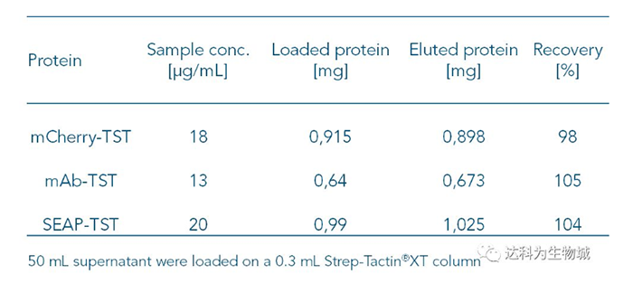 因Strep-Tactin?XT與Twin-Strep-tag蛋白的高親和力,即使目標(biāo)蛋白的濃度低,使用Strep-Tactin?XT仍可以有效的捕捉上清中的目標(biāo)蛋白。表C整理了幾個(gè)實(shí)驗(yàn)的數(shù)據(jù),顯示當(dāng)目標(biāo)蛋白濃度低于20μg/ml時(shí),得率仍能達(dá)到幾近100%。