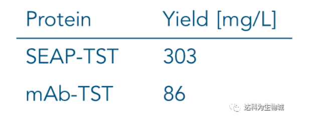 除了上述實(shí)驗(yàn)所用的CHO細(xì)胞株外(中國(guó)倉(cāng)鼠卵巢細(xì)胞),另一常用于生產(chǎn)蛋白的哺乳動(dòng)物細(xì)胞株為HEK293(人胚胎腎細(xì)胞),使用上較CHO簡(jiǎn)單。我們測(cè)試了Strep-Tactin?XT的純化表現(xiàn):表D1為以Expi293表達(dá)SEAP-TST或mAb-TST蛋白后,目標(biāo)蛋白的濃度。圖D2為純化表現(xiàn)的SDS-PAGE分析。從中可知,與ExpiCHO培養(yǎng)基相同,直接將表達(dá)好的Expi293上清加入1ml Strep-Tactin?XT高載量重力柱中進(jìn)行純化,一樣能夠快速的得到高純度的目標(biāo)蛋白。