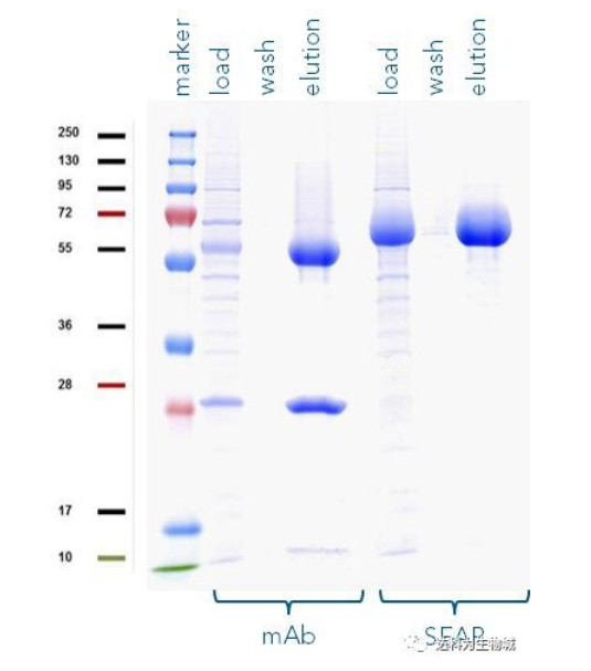 此外,我們也測(cè)試了其他的蛋白,例如SEAP(72 kDa)或抗體(mAb,其重鏈為55kDa)。圖B為以Strep-Tactin?XT純化SEAP-TST、mCherry-TST與mAb-TST的SDS-PAGE分析結(jié)果,可見(jiàn)對(duì)于不同蛋白,Strep-tag?系統(tǒng)都能純化出高純度的目標(biāo)蛋白。(注:紅色標(biāo)記處為 mCherry的降解產(chǎn)物,非雜帶)