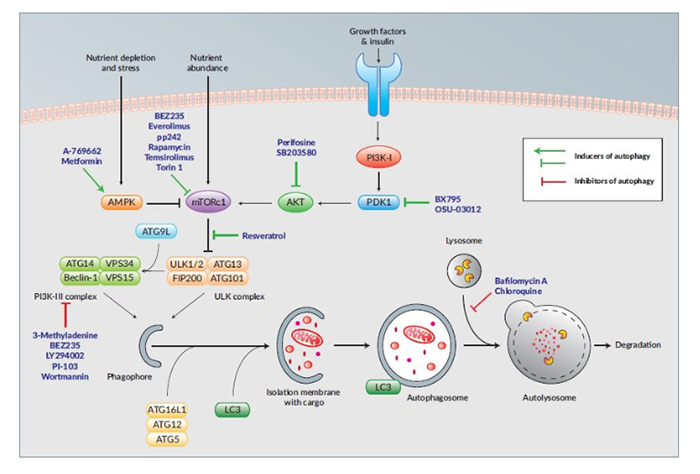 自噬是原生分解程序,由細胞內應激物(營養物和能量貧乏)引起。自噬由生成自噬體開始,這一步驟由一系列蛋白調控,包括VPS34型磷脂酰基醇(PI)3激酶復合體,隨后與溶酶體的融合將自噬體酸化。自噬的阻斷有多種形式,例如PI3激酶抑制劑可通過抑制自噬捕獲動作而阻斷自噬進程,或者用抑制溶酶體酸化的抑制劑阻止自噬溶酶體的形成和自噬降解。自噬進程是被縝密調控的。mTORC1,一種對營養物和生長因子敏感的激酶,是自噬的主要阻遏器。因此,mTORC1及其信號通路的抑制劑可誘導產生自噬。