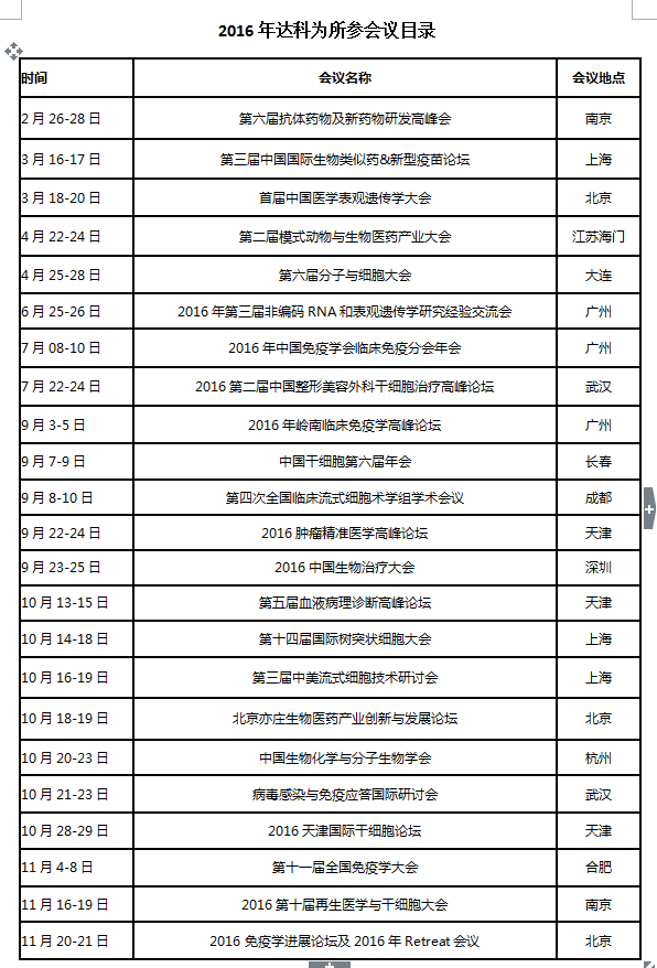 2016年達(dá)科為生物技術(shù)有限公司參展會(huì)議列表